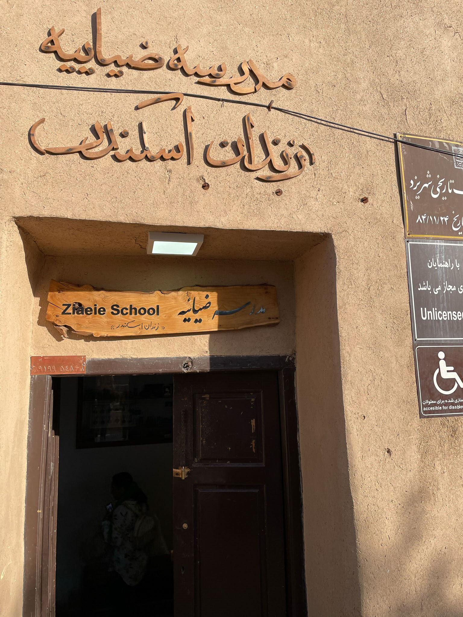 Outside the Zia'leh School is a fine ceramics and textile store, intricate and delicate work, as proven by the sign at the top!